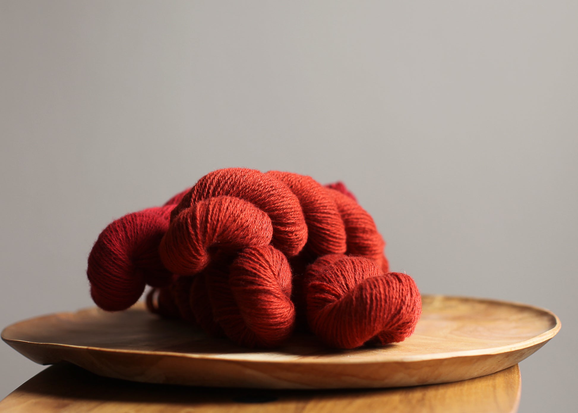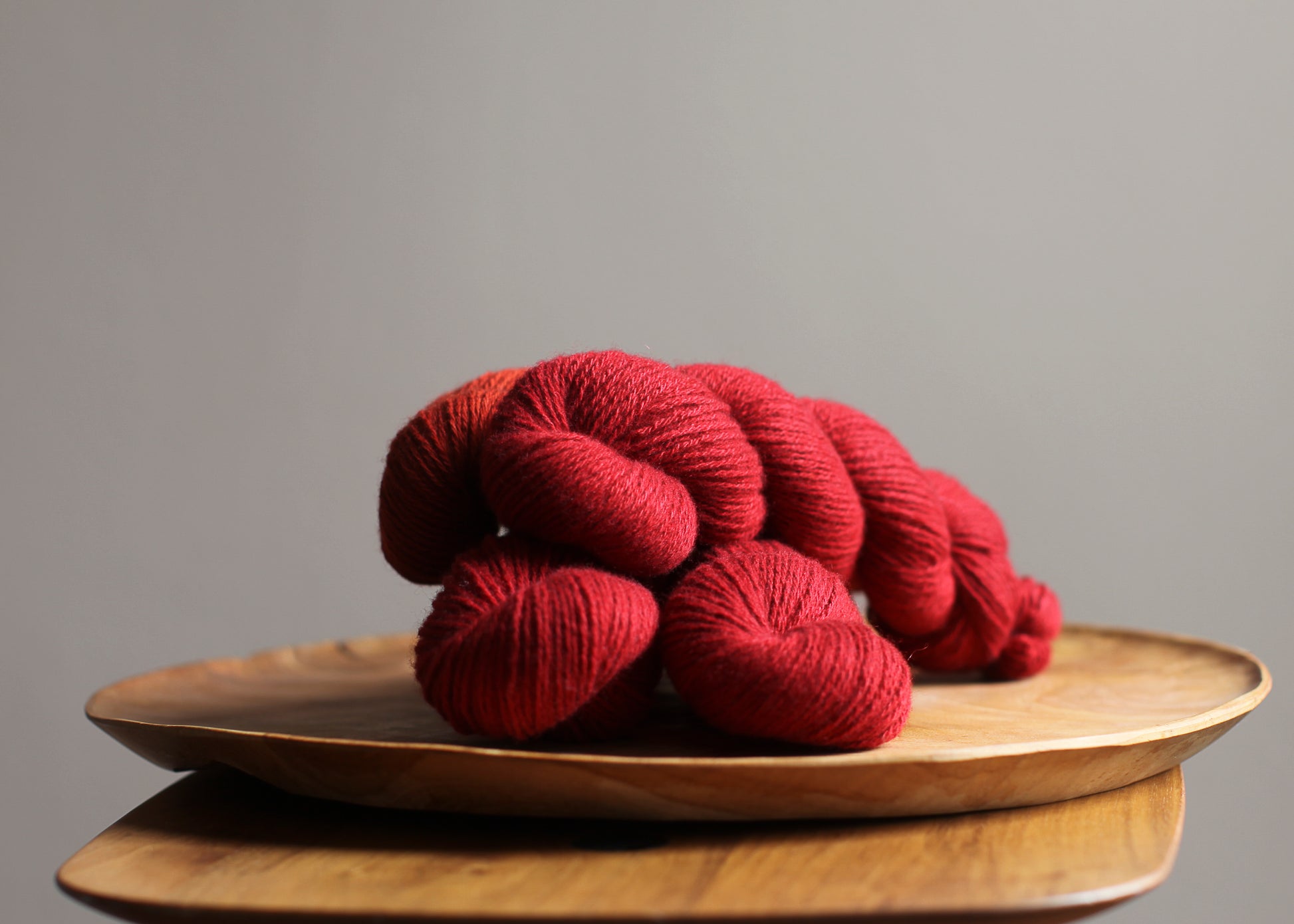 Redcurrant: Tart little berries, redcurrants are great as a jelly accompaniment. I find them too sour to enjoy without mountains of sugar, but luckily we're knitting the colour. It grows wild in hedgerows although doesn't produce as much fruit as it would tamed in a garden. It's a very intense, clear red, leaning towards tomato rather than magenta.