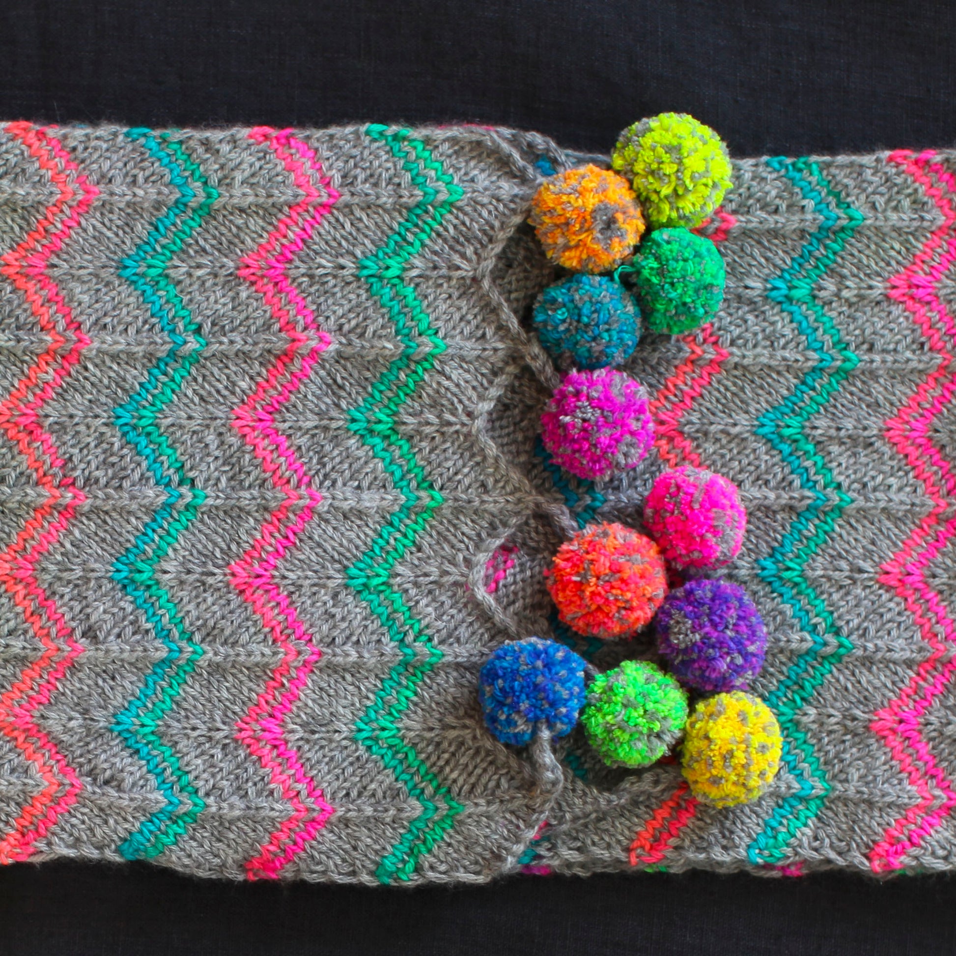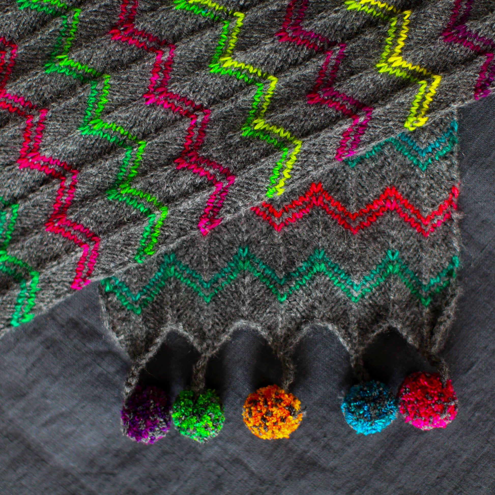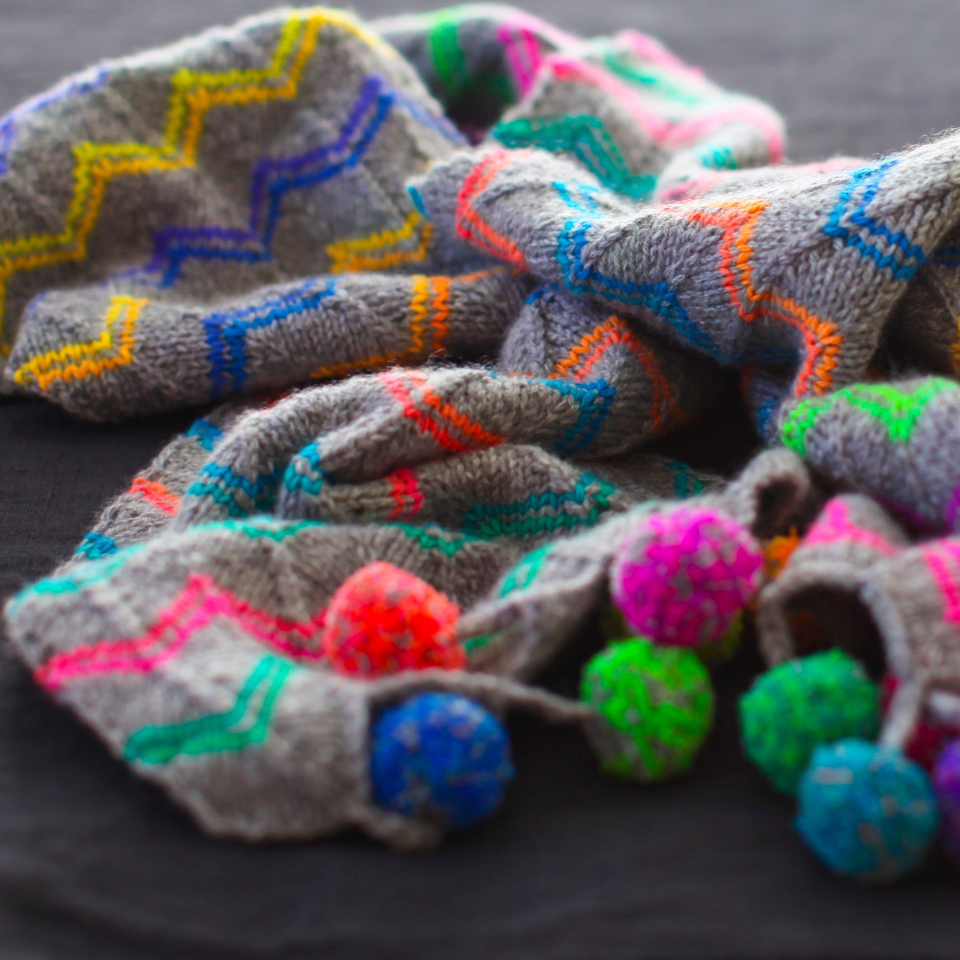 Using just stocking stitch, increases and decreases, only one colour is knit with at a time. Difficulty level: beginner / intermediate, suggested needle size is 4mm using circular needles. Circular needles are important as you'll be sliding the work back and forth in the striping sections.
