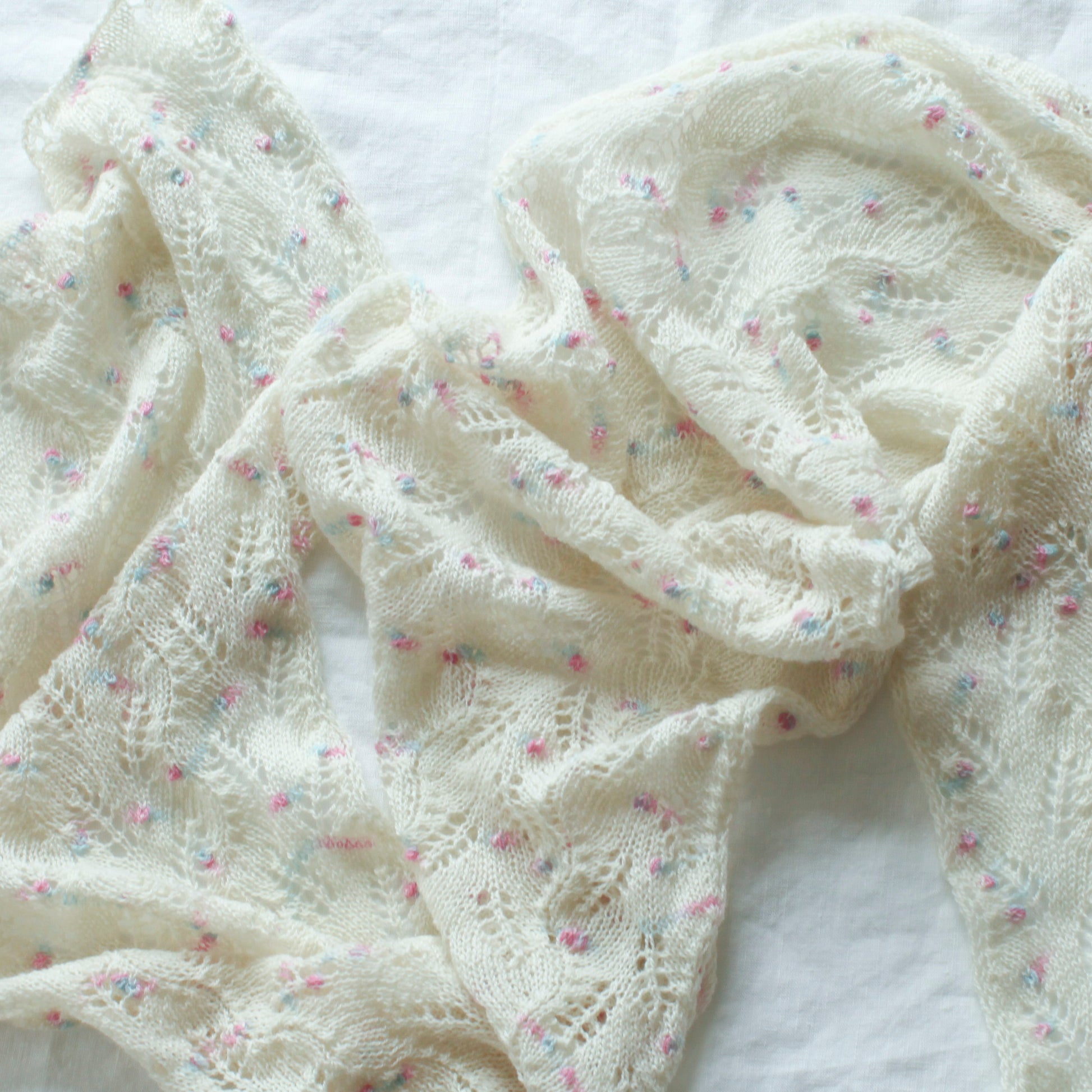 A simple lace pattern knitted in conjunction with nups worked in the contrast sections of yarn. Incredibly light, yet very warm, this is the perfect summer accessory.